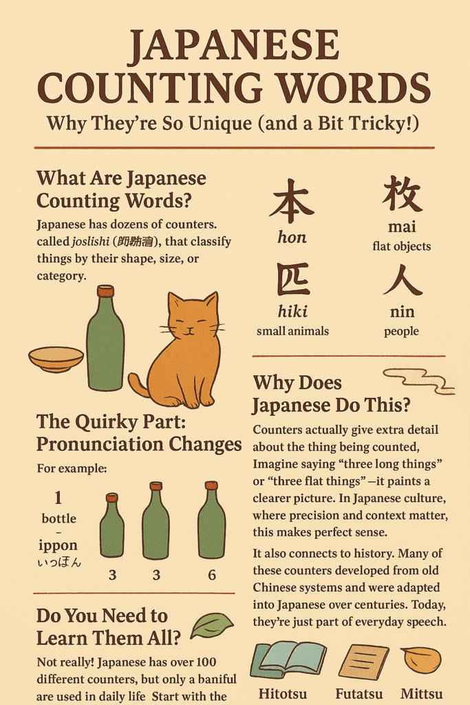 Japanese counting words might seem overwhelming at first, but they’re actually a fascinating window into how language reflects culture. Instead of just memorizing, try noticing how they make everyday objects sound more specific and alive.